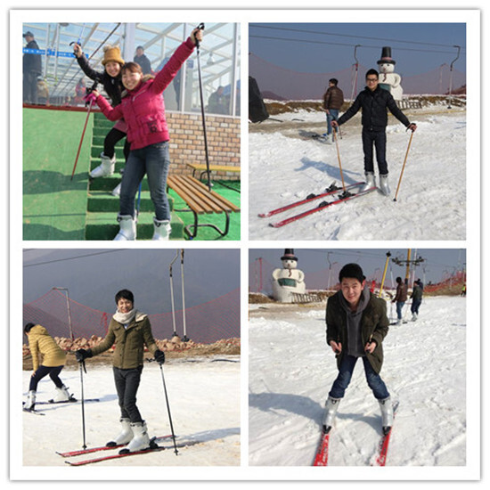 到达山顶的大厅,伙伴们迫不及待地去领滑雪用具,由教练带领着进入雪场。每个人都在认真地跟教练学做:穿雪鞋—站立—刹车—控制下滑的步骤。雪场上不时有人摔的四仰八叉,但大家都很快爬起来继续玩耍。