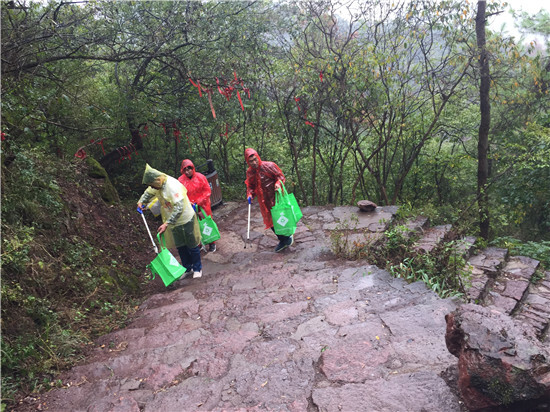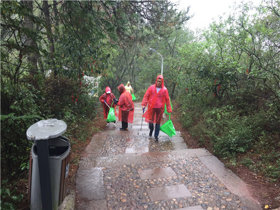 天公不作美,密集的雨点从四面八方打来,却丝毫没有影响大家的兴致,抵达终点后,大家各自拿好夹子和垃圾袋,穿好雨衣,一切就绪后,就开始行动啦。因为下雨,大家互相帮忙,风雨无阻,不放过任何一个死角,捡拾一路上的各种垃圾。随行队伍中,一位供应商朋友带了自己的小孩来参加此次公益活动,要给小孩从小树立保护环境,不乱扔垃圾的好习惯。到达半山腰的时候,大家休息了一会,等待后面的伙伴们一同前行。在大家的欢声笑语中,很快就到达了山顶,山顶云雾缭绕,下雨后空气也变得格外清新。