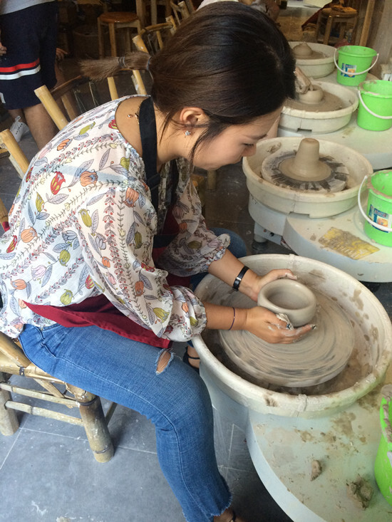 在很短的时间内,老师以最简单而专业的方式教我们在转动的拉坯机上制作个性实用器皿,如杯子,碗,花瓶,盘子等。接着,我们都放开手脚开始“创作”我们自己的陶艺作品。