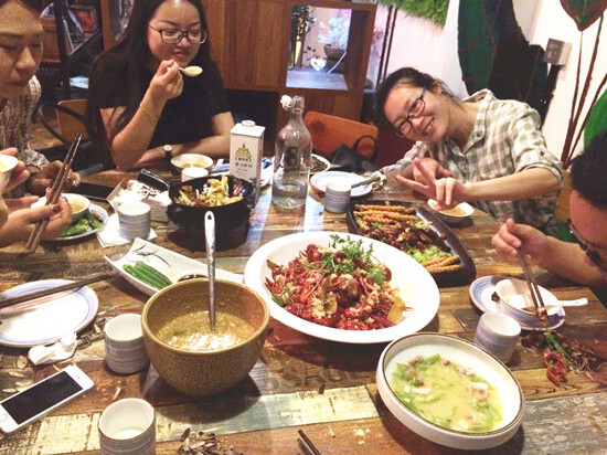 一片笑声中,太阳不知不觉已经下山了。民以食为天,“时光餐厅”就是我们的下一站。抬头一看,一块块阶梯组成的小鱼形象,栩栩如生;脚下又是一个个玻璃瓶盖组成的特色的“时年”,欢迎仪式独具一格。在美味中,大家你一言我一语,果然是时光流年~