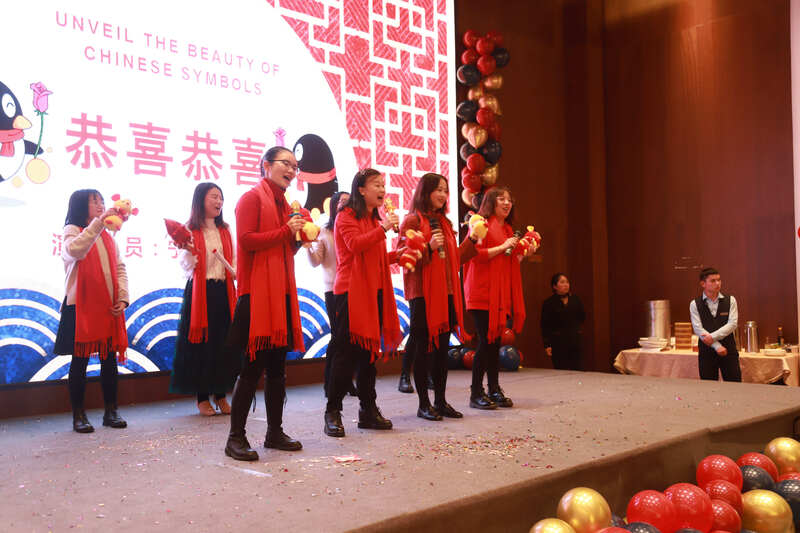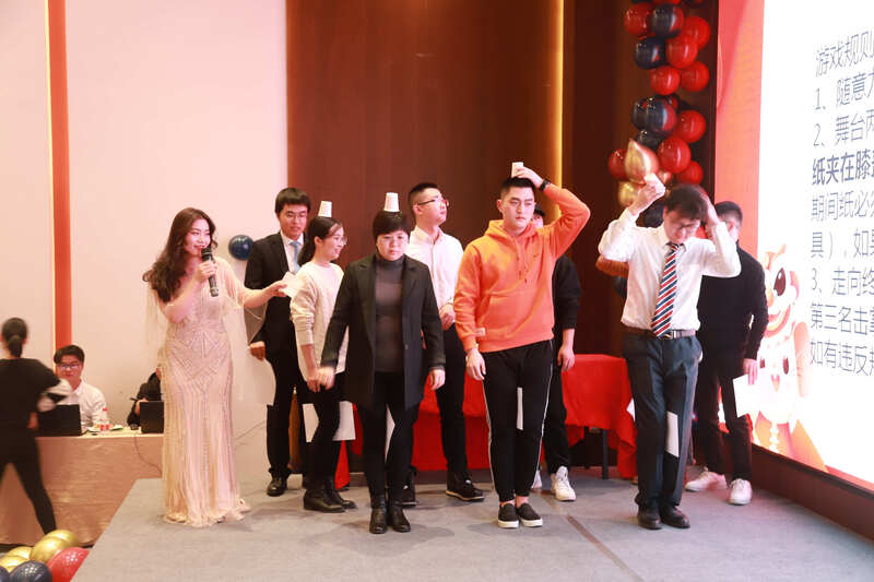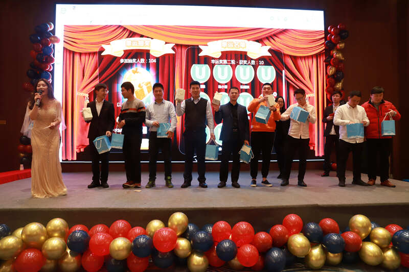 会议结束后,大家陆续到达晚宴地点。一进门,就看到两位大财神正捧着金元宝在发入场红包,场地的桌椅都铺上了喜庆的大红布,伴着《新春序曲》的音乐,年会的热闹劲儿扑面而来。晚会上,小人舞、3D游戏、抖乒乓球比赛、荧光舞、惊喜环节、相声合唱不一而足,颇具新意。当然晚会也少不了各种抽奖活动,幸运大屏滚动,每个小伙伴彼时都希望自己成为幸运的锦鲤,而不定时的抢红包环节更是让现场伴随着阵阵尖叫。