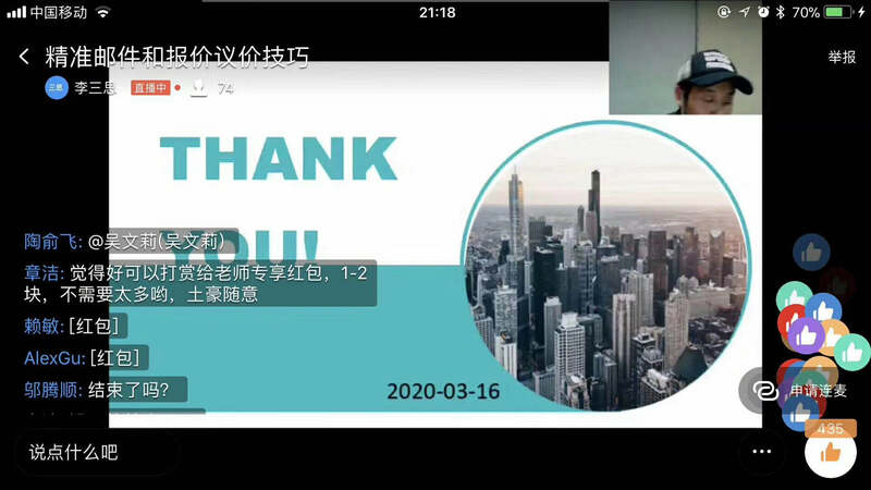 3月21日,j9九游会官方网站学院终于迎来了第一节直播课程《精准邮件和报价议价技巧》。开课之前,讲师依次点名。课堂上,讲师时而进行互动、时而分享小故事,同学们都积极回应,踊跃表达自己的看法,成功带动了课堂氛围。同时,也有很多同学给讲师直播打赏,打赏金额虽然不大,但对讲师却是莫大的肯定与鼓励。