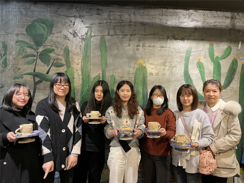 当天中午,大家约在鼓楼的“桃妆”吃饭,这是一家老网红,菜色和环境都很不错。最有特色的就是桃花酒啦,很值得一品,我们豪气地一人来了一碗,干杯!午餐结束后则是最期待的陶艺DIY时间。大家各自选好想要制作的作品,开始埋头认真制作。大家都是第一次做陶艺,手艺生疏得很,还好有老师指点,做出来的作品也都富有特色。