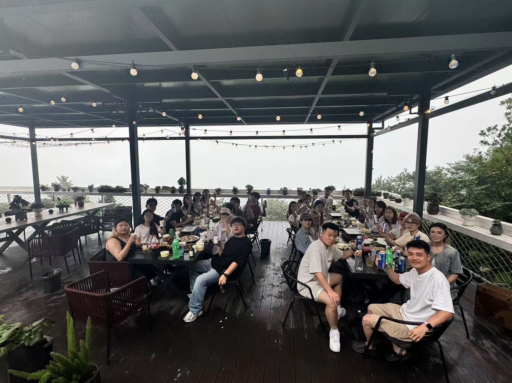 山风渐凉时,雨声淅淅沥沥。天空一声巨响,采购部头号一姐拿着麦克风跟着驻场的钢琴手开始show time,一首清美悠扬的歌声骤然响起,为晚餐拉开了完美的序幕。长桌上摆满了热气腾腾的菜肴,冰镇的啤酒与饮料冒着细密的气泡,大家围坐在一起,边吃边聊。舒缓的旋律在山间流淌,混着饭菜的香气与大家的谈笑声,格外惬意。
